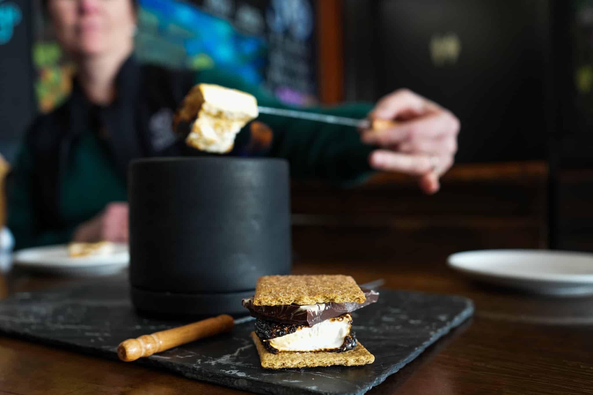 Whether you are finishing up a delicious meal in our dining room or just stopping by for a sweet treat, we are bringing the campfire vibes indoors—right to your table. Join us Fridays this winter from 4:00 pm – 7:00 pm for the perfect dessert experience, serving up interactive tabletop s’mores kits, giving you your own personal flame to roast marshmallows to perfection.